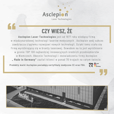 Asclepion Laser Technologies to niemiecki producent laserów medycznych działający od 1977 roku. Firma jest międzynarodowym liderem w branży technologii laserowych, wyróżnionym w gronie TOP 100 najbardziej innowacyjnych średnich przedsiębiorstw w Niemczech. Produkty marki Asclepion posiadają certyfikaty medyczne CE oraz FDA i cieszą się zaufaniem w ponad 70 krajach na całym świecie.